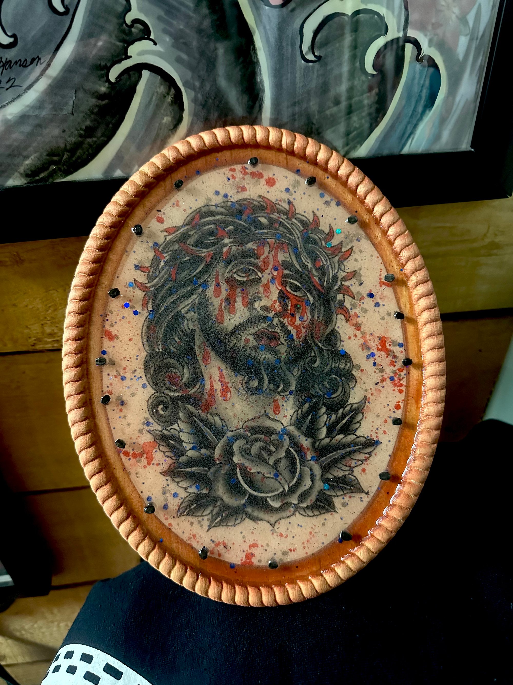 Hand painted Icon of Christ resined to a 8x10 wood oval embellished with nails ready to display.